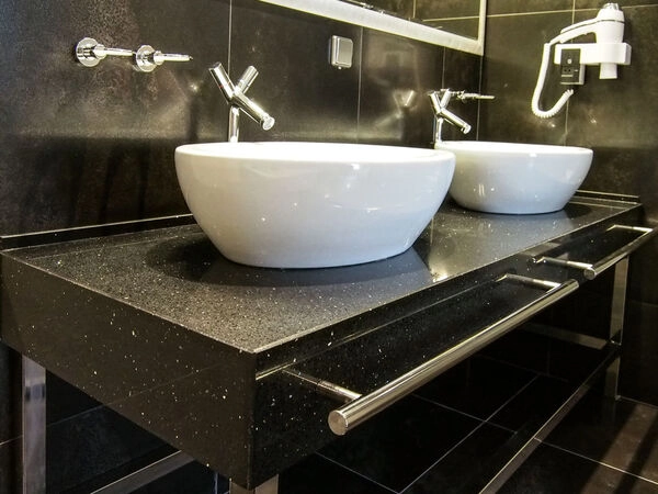 Столешница в ванную комнату из искусственного камня не боится этих вызовов. Она: