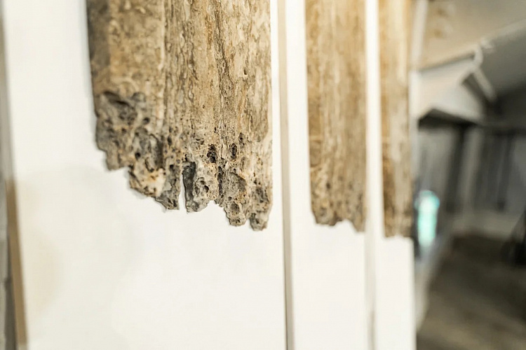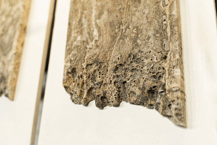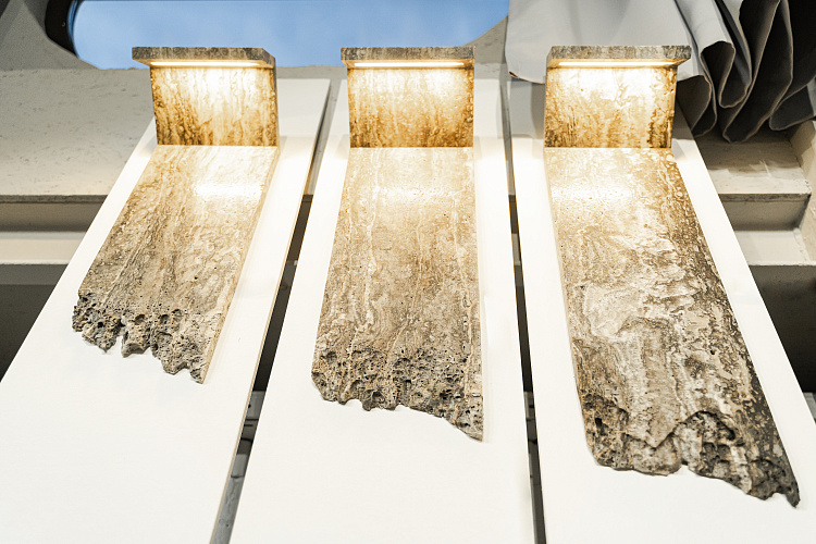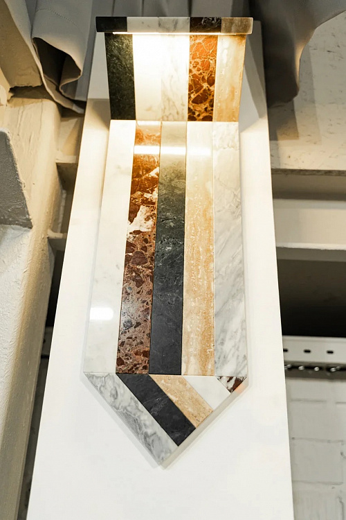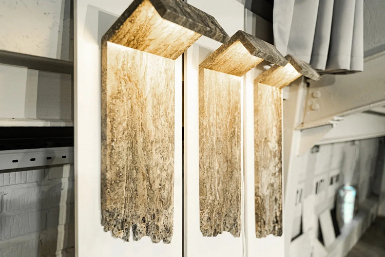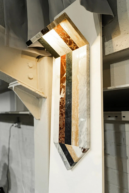Integrity of nature - сложный настенный светильник, который сочетает в себе четыре вида мрамора: Bianco Carrara, Rosso Levanto Verde Guatemala, Bardiglio Imperiale. А дополняет их травертин Noche.