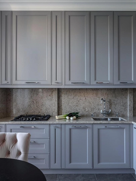 Кухня с серо-голубым фасадом и светлой столешницей из кварцевого агломерата Vicostone Oyster BQ9330.