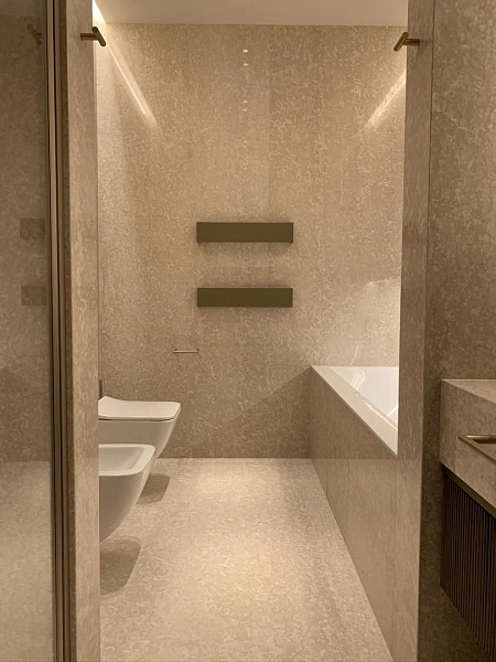 Ванная комната в бежевых тонах с облицовкой стен и пола натуральным камнем. Архитектор Анна Высоких @torsher_design_studio